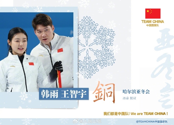 北京時(shí)間2月8日,哈爾濱亞冬會(huì)冰壺項(xiàng)目混雙決賽,中國(guó)隊(duì)組合韓雨/王智宇在與菲律賓隊(duì)的銅牌賽角逐中獲勝,收獲一枚銅牌,這是本屆亞冬會(huì)中國(guó)隊(duì)的首枚獎(jiǎng)牌。