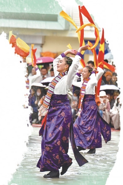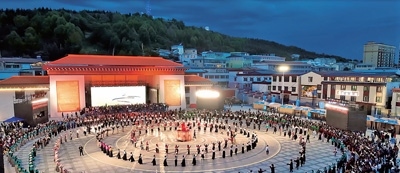 春節(jié)假期,每到傍晚時(shí)分,四川省阿壩藏族羌族自治州若爾蓋縣城中心的北上廣場(chǎng)都會(huì)準(zhǔn)時(shí)響起歡快的鍋莊曲,遠(yuǎn)道而來(lái)的游客與當(dāng)?shù)厝罕娨黄鹛饸g快的鍋莊。伴著音樂(lè),鮮艷的長(zhǎng)袖在風(fēng)中劃出道道弧線,腰飾隨著舞步搖曳,男女老少圍成一圈、翩然起舞。