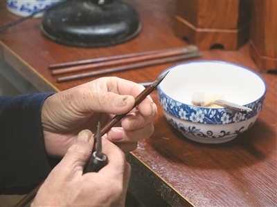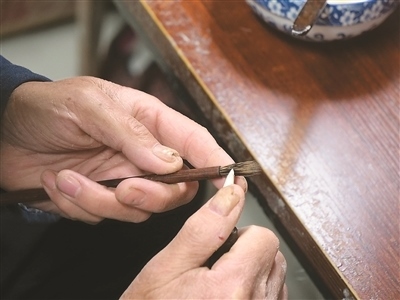 把毛料放在水中仔細清洗,就著燈光剔除一根根細微雜毛,將清理后的毛料聚合成圓直光滑、攏抱不散的錐形……走進涇縣涇川鎮(zhèn)宣筆制作技藝代表性傳承人佘征軍的工作室,他正在為一支紫毫筆制作筆頭。“白居易有詩云,‘宣城之人采為筆,千萬毛中揀一毫’。此句講的是宣筆制作工藝的復(fù)雜精細?!辟苷鬈娬f。