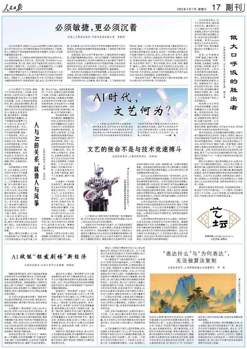 人工智能(AI)是科學(xué)技術(shù)發(fā)展到新一輪的最新變革,它不僅推動產(chǎn)業(yè)升級,改變傳統(tǒng)經(jīng)濟(jì)的面貌,而且對人類社會生活產(chǎn)生深遠(yuǎn)影響,也必將深刻地改變文藝和文學(xué)。文藝工作者應(yīng)該具備感知時代變革的能力,大膽學(xué)習(xí)研究新生事物,讓傳統(tǒng)藝術(shù)的創(chuàng)作插上新的時代翅膀。2025年全國兩會召開之際,本版約請全國人大代表、全國政協(xié)委員共同探討“AI時代,文藝何為?”這一話題,以饗讀者。