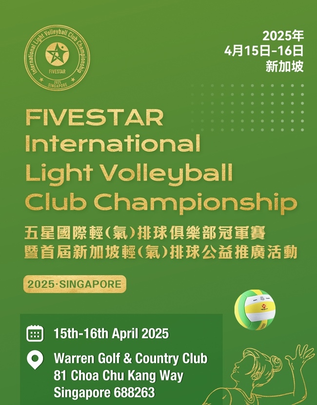 2025年4月15日至16日,2025“五星”國(guó)際輕(氣)排球俱樂(lè)部冠軍賽將在新加坡Warren Golf &Country Club啟幕,這也是氣排球首次登陸新加坡。