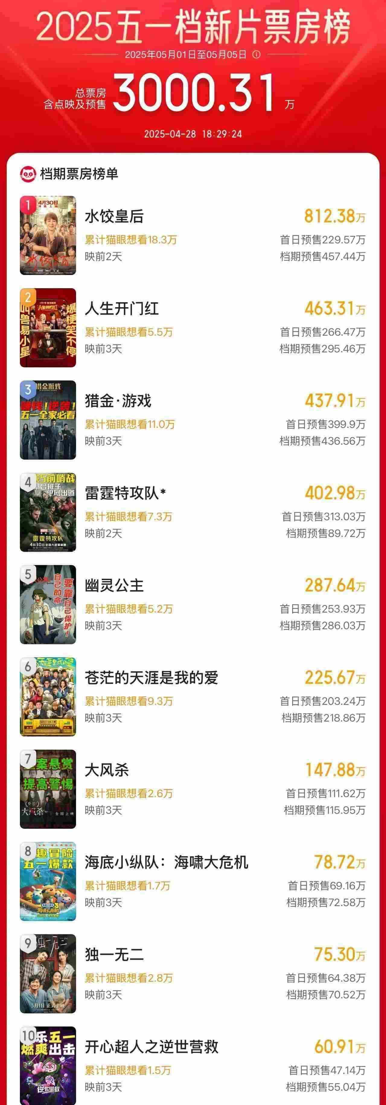 據(jù)網(wǎng)絡(luò)平臺(tái)數(shù)據(jù),截至4月28日18時(shí)29分,2025年“五一”檔新片預(yù)售總票房破3000萬,《水餃皇后》《人生開門紅》《獵金·游戲》分列前三位。