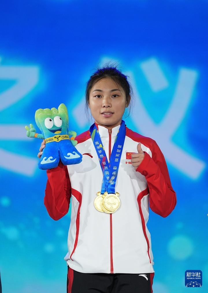 5月10日,中國選手張海琴在頒獎儀式上。最終,她獲得抓舉、挺舉、總成績?nèi)椆谲?,并打破這三項世界青年紀錄。新華社記者 侯昭康 攝