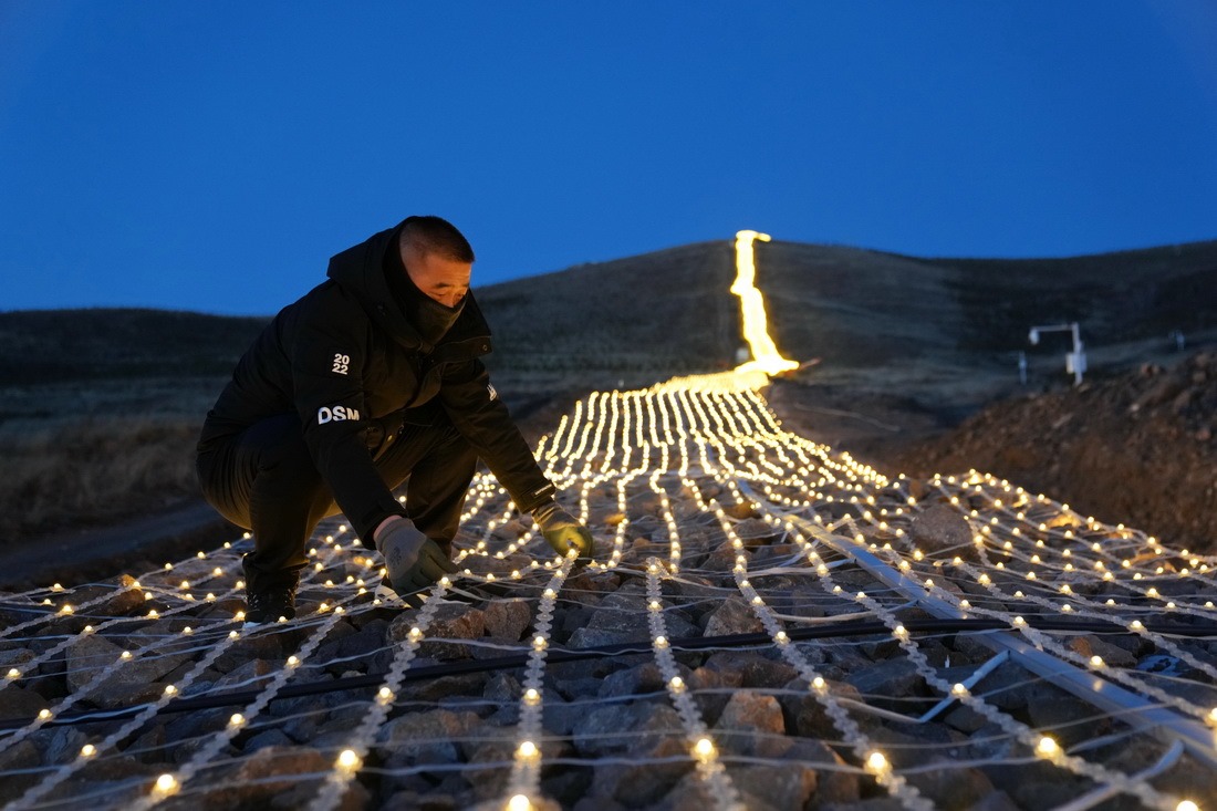12月30日,工作人員在崇禮長城景觀展示亮化工程現(xiàn)場檢查燈帶。新華社記者 牟宇 攝
