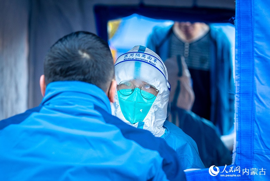呼和浩特市玉泉區(qū)一處核酸采樣點,醫(yī)護人員為居民進行核酸檢測。丁根厚攝