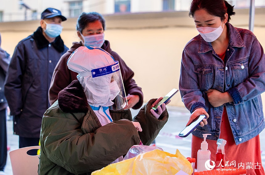 呼和浩特市玉泉區(qū)一處住宅小區(qū),社區(qū)網(wǎng)格員在查驗準備去核酸檢測點居民的健康碼。丁根厚攝