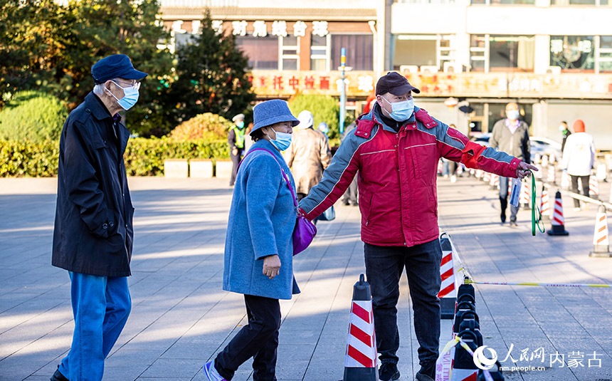 呼和浩特市玉泉區(qū)一處核酸篩查點,工作人員引導(dǎo)老年人通過綠色通道接受核酸檢測。丁根厚攝