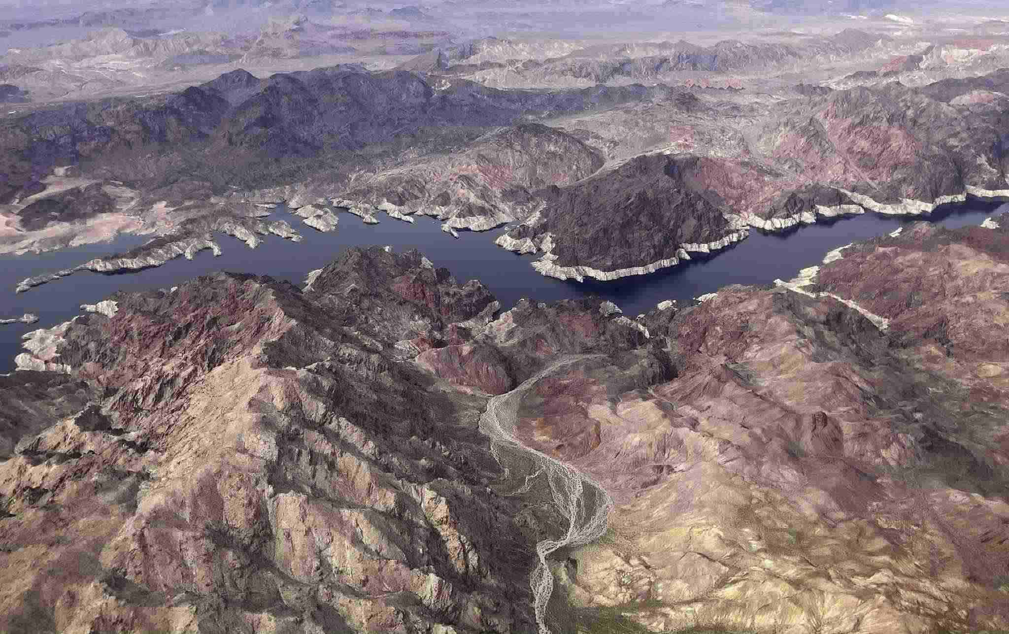 當?shù)貢r間2023年3月6日,美國內(nèi)華達州博爾德市,沿著內(nèi)華達州和亞利桑那州的邊界,“浴缸環(huán)”顯示了米德湖的水位線。