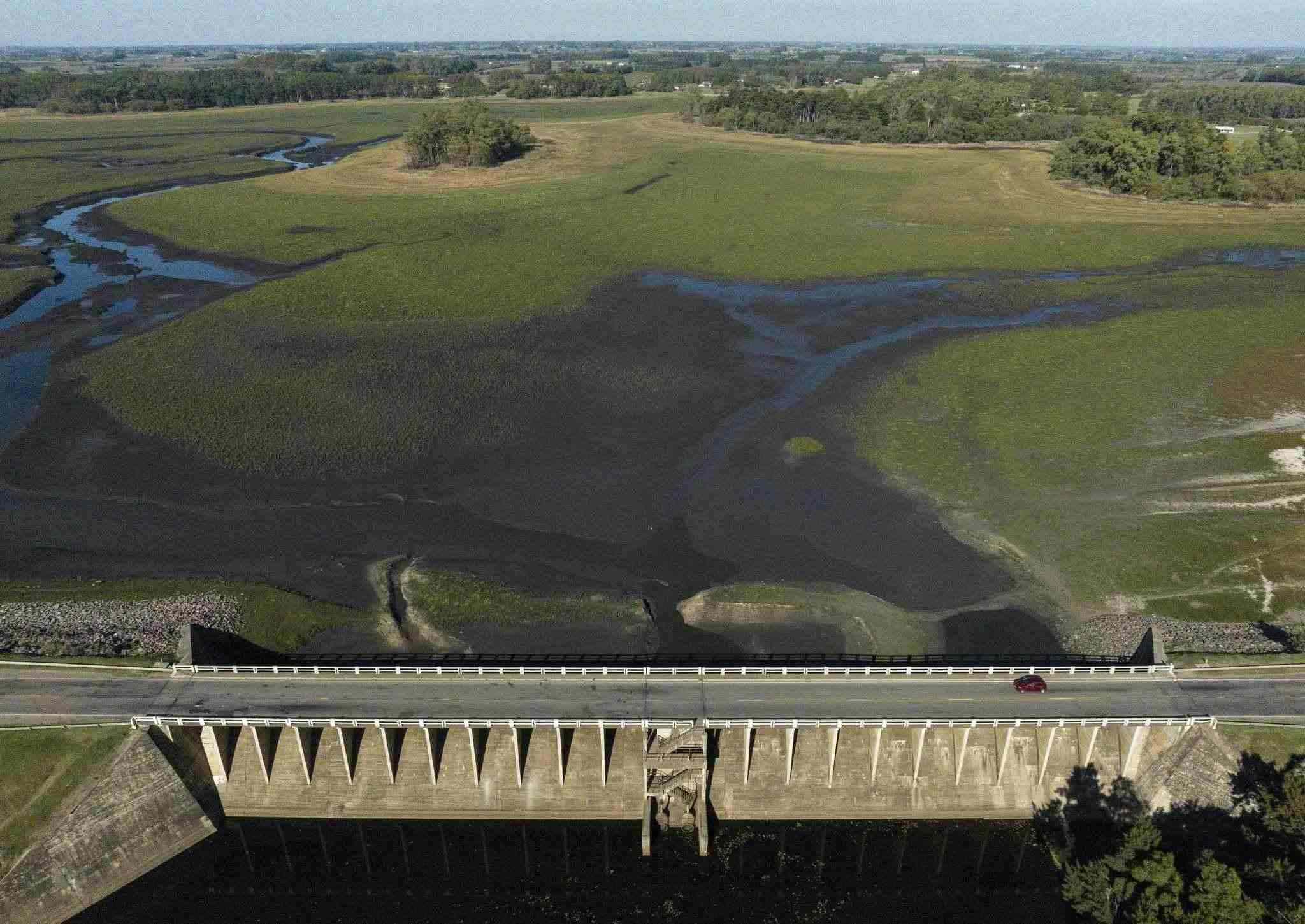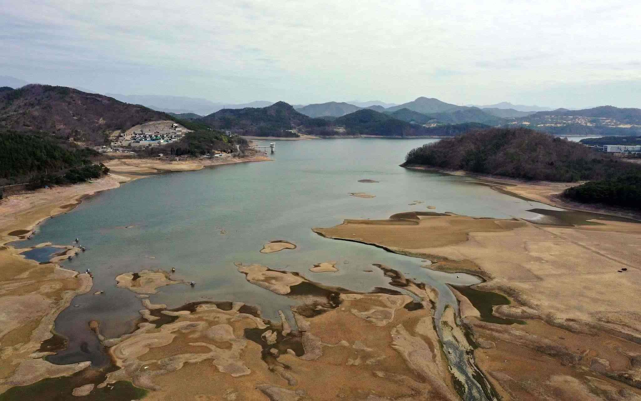 當?shù)貢r間2023年3月21日,韓國羅州,羅州湖遭遇嚴重干旱,水量下降,河床裸露。
