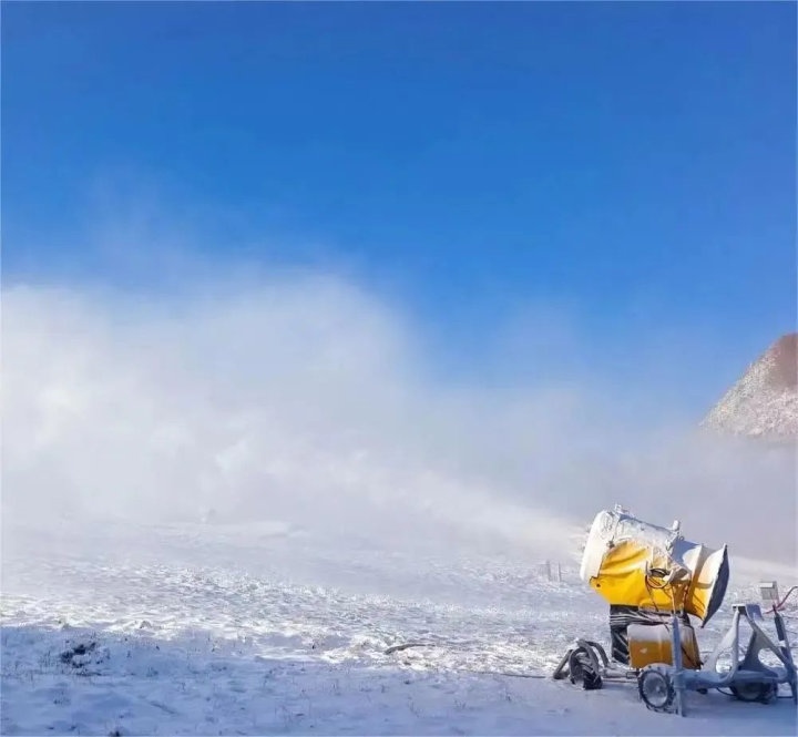位于赤峰市喀喇沁旗的美林谷滑雪場在11月6日下午3點(diǎn)開機(jī)造雪,共布造雪機(jī)40臺。從炮筒周圈噴出的水霧,在雪炮扇葉攪動的大風(fēng)加持下立刻凝結(jié)成雪霧和冰霜,被吹到7-8米遠(yuǎn)的地上,只過了不到半分鐘,雪炮正前方就凝結(jié)出了一條潔白的雪道。美林谷滑雪場“十四冬”賽道長550米,寬55米,造雪厚度1米,造雪工作將根據(jù)氣候濕度等條件進(jìn)行相應(yīng)調(diào)整,預(yù)計(jì)造雪時間為45至48天,12月中旬將造完40萬平方米雪。