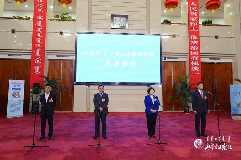 1月27日晚,自治區(qū)十三屆人大四次會議“代表通道”集中采訪活動在內(nèi)蒙古人民會堂玻璃廳舉行,8位人大代表分兩組“亮相”。這是自治區(qū)人大首次開通“代表通道”。圖為人大代表樸成奎、胡成東、云霖瓊和李全文4位代表(從左至右)回答記者提問。內(nèi)蒙古日報記者 金泉 攝