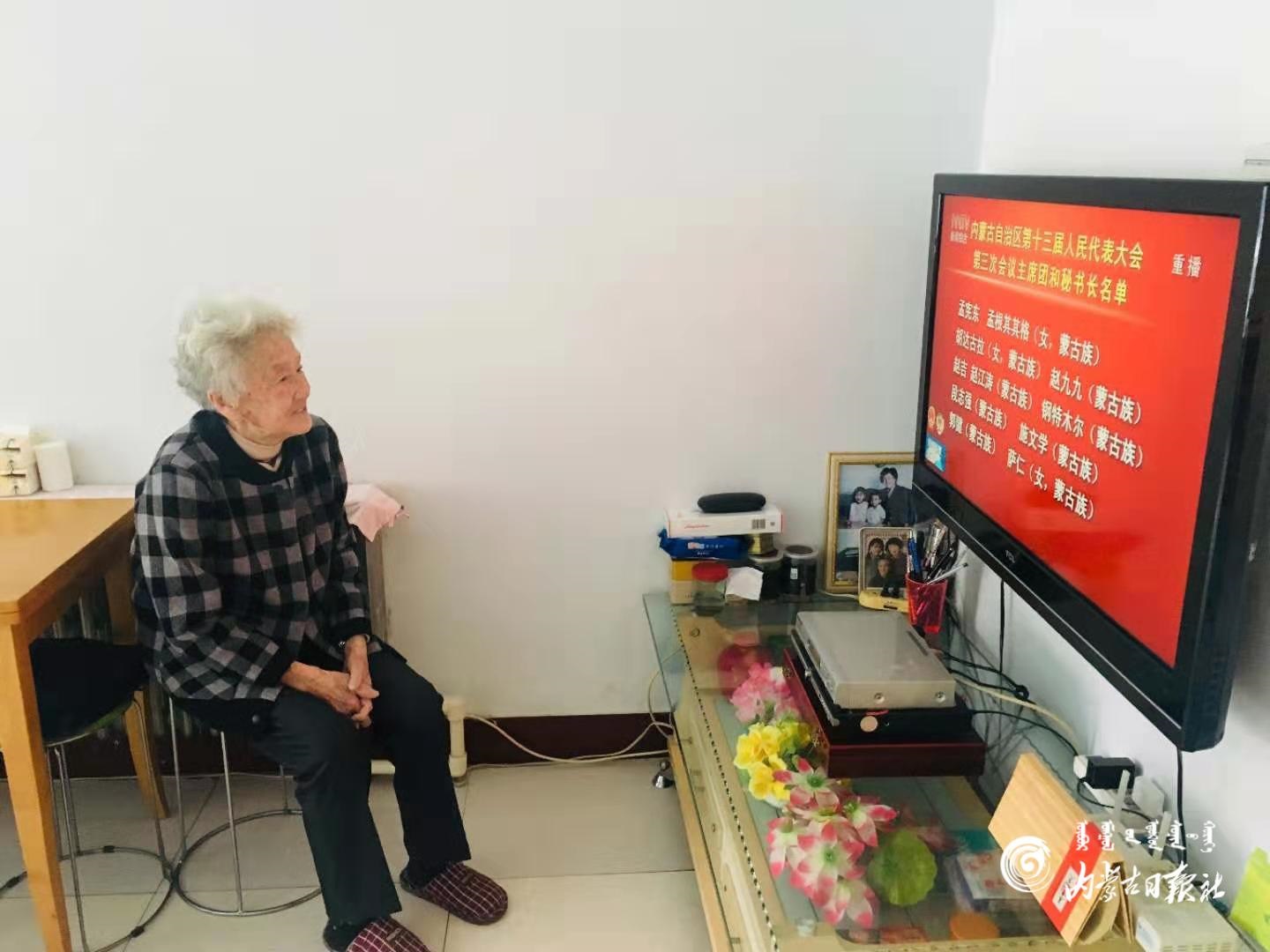 濱河社區(qū)82歲的老黨員田炬恒觀看自治區(qū)十三屆人大三次會(huì)議開(kāi)幕直播。