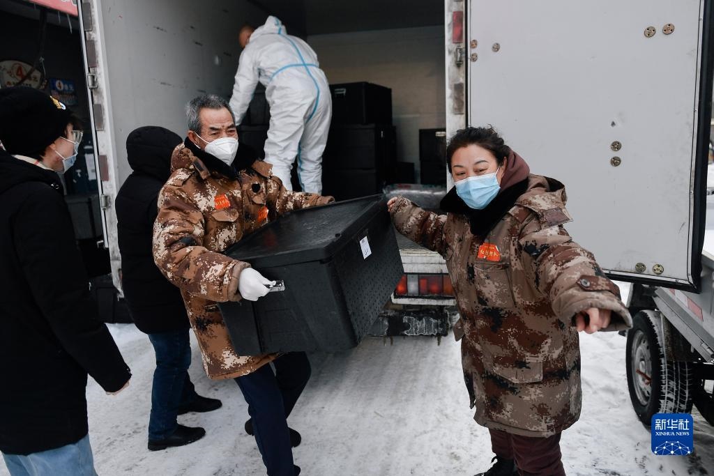 趙淑華(右一)指揮社區(qū)工作人員和志愿者搬運(yùn)盒飯(2021年2月15日攝)。趙淑華是吉林省通化市東昌區(qū)團(tuán)結(jié)街道文化社區(qū)副主任、網(wǎng)格長(zhǎng),臨近退休的她毫不猶豫投身抗疫一線。新華社記者 許暢 攝