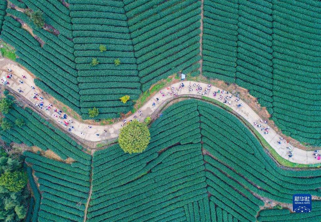 團(tuán)隊(duì)游客在杭州市富陽區(qū)拔山村萬畝茶山游覽(2018年3月26日攝,無人機(jī)照片)。浙江省“千村示范、萬村整治”工程撬動(dòng)了鄉(xiāng)村從美麗生態(tài)到美麗經(jīng)濟(jì),再到美好生活的良性循環(huán)。2018年,浙江“千萬工程”獲得聯(lián)合國(guó)“地球衛(wèi)士獎(jiǎng)”中的“激勵(lì)與行動(dòng)獎(jiǎng)”。新華社記者 徐昱 攝