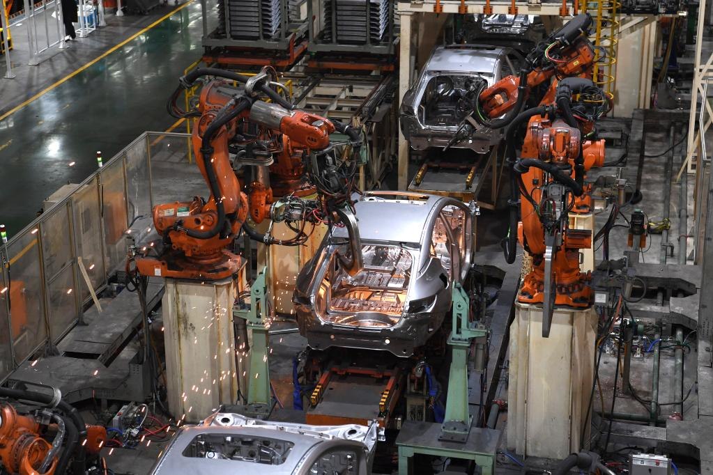 工業(yè)機(jī)器人在江淮汽車乘用車焊接車間生產(chǎn)線上工作(2月22日攝)。新華社記者 劉軍喜 攝