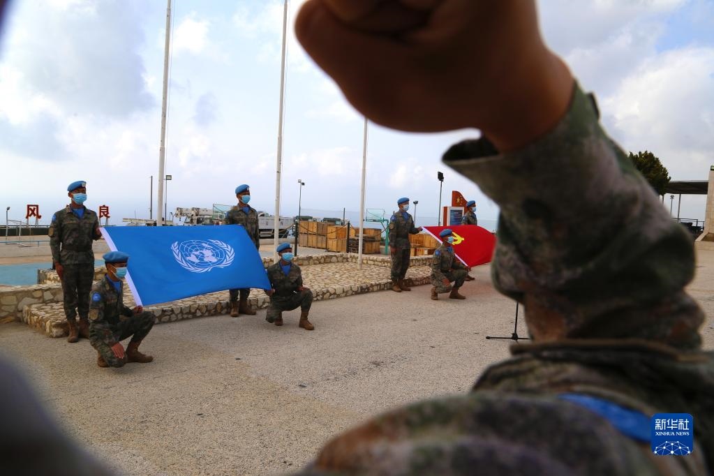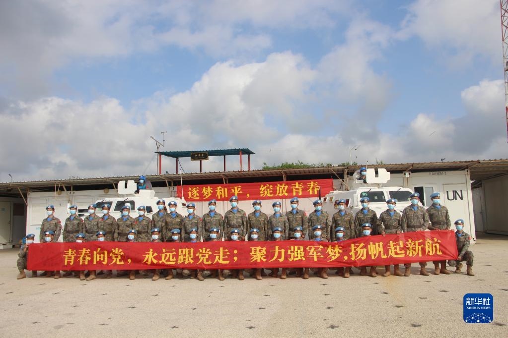 “我宣誓:忠于黨,忠于社會主義,忠于祖國,忠于人民……揚藍盔精神,展大國形象,為祖國爭光,為軍旗添彩?!敝袊伯a(chǎn)主義青年團成立100周年之際,在黎巴嫩南部提爾市沙馬村的中國維和營區(qū),中國第20批赴黎巴嫩維和建筑工兵分隊的官兵們頭戴貝雷帽,身穿配有五星紅旗臂章的星空迷彩服,擺成數(shù)字“100”的隊形,面向國旗和聯(lián)合國旗莊嚴(yán)宣誓。