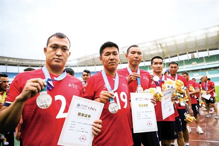 7月26日,內(nèi)蒙古隊(duì)球員展示銀牌。當(dāng)日,第十四屆全國(guó)運(yùn)動(dòng)會(huì)群眾比賽足球項(xiàng)目十一人制男子農(nóng)村鄉(xiāng)鎮(zhèn)組決賽在大雨中開(kāi)戰(zhàn)。最終經(jīng)過(guò)90分鐘的爭(zhēng)奪,代表內(nèi)蒙古出戰(zhàn)的錫尼河鎮(zhèn)隊(duì)與陜西隊(duì)?wèi)?zhàn)成1:1平,在隨后進(jìn)行的點(diǎn)球大戰(zhàn)中,內(nèi)蒙古隊(duì)2:4不敵對(duì)手,獲得該項(xiàng)目的亞軍。(攝影/北方新報(bào)正北方網(wǎng)記者 牛天甲)